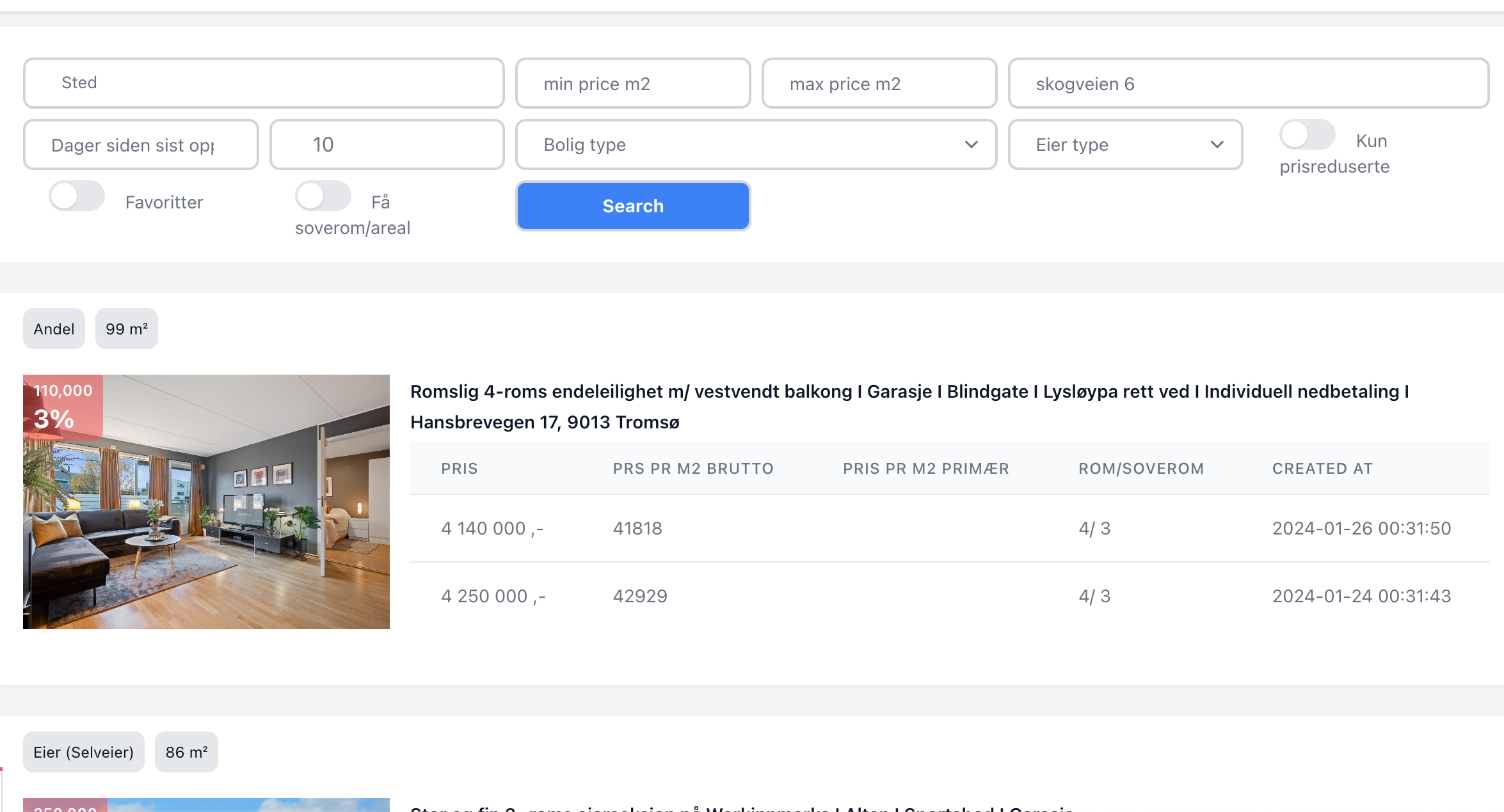 Vi gir deg også andre kraftfulle filtre, inkludert maks/min pris pr m2, boligtype, eiertype og siste oppdateringstidspunkt. Disse verktøyene gir deg muligheten til å skreddersy søket ditt og finne de skjulte skattene i eiendomsmarkedet.